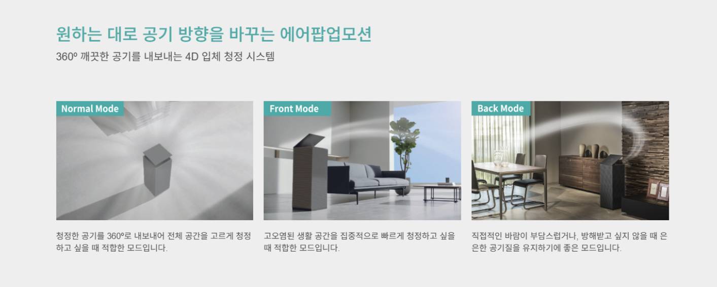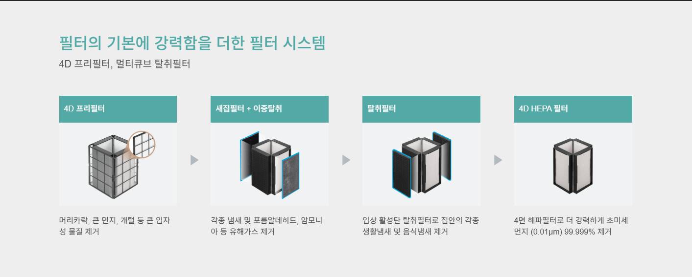 | Filtration | º 4D 프리필터 º 새집 필터 º 이중 탈취 필터 º 멀티큐브 탈취 필터 º 4D HEPA 필터 |