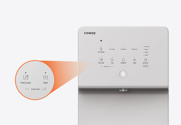 ※ 전체 잠금 기능은 온수잠금 버튼과 정수 버튼을 동시에 터치하여 설정합니다.